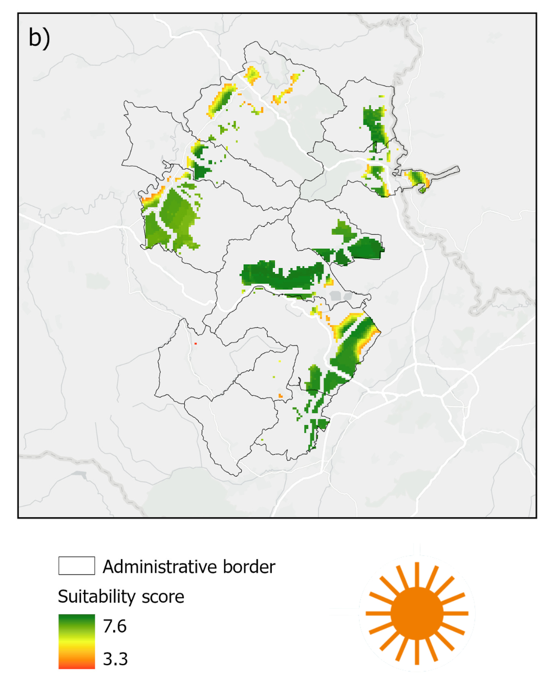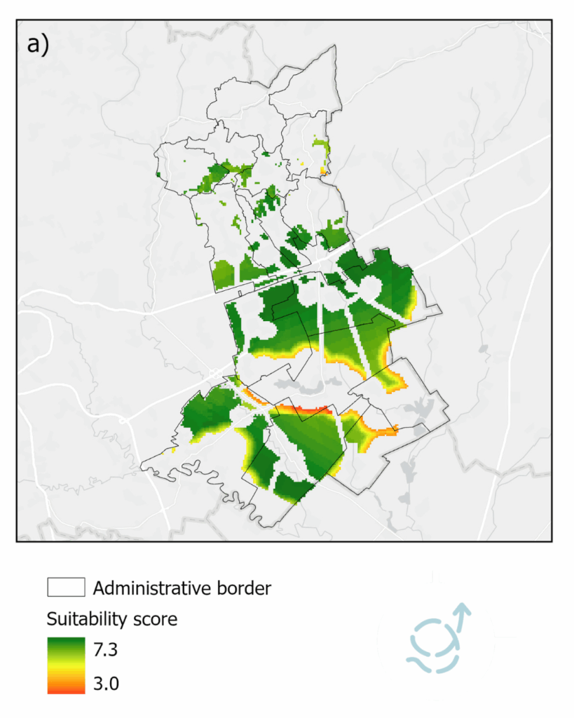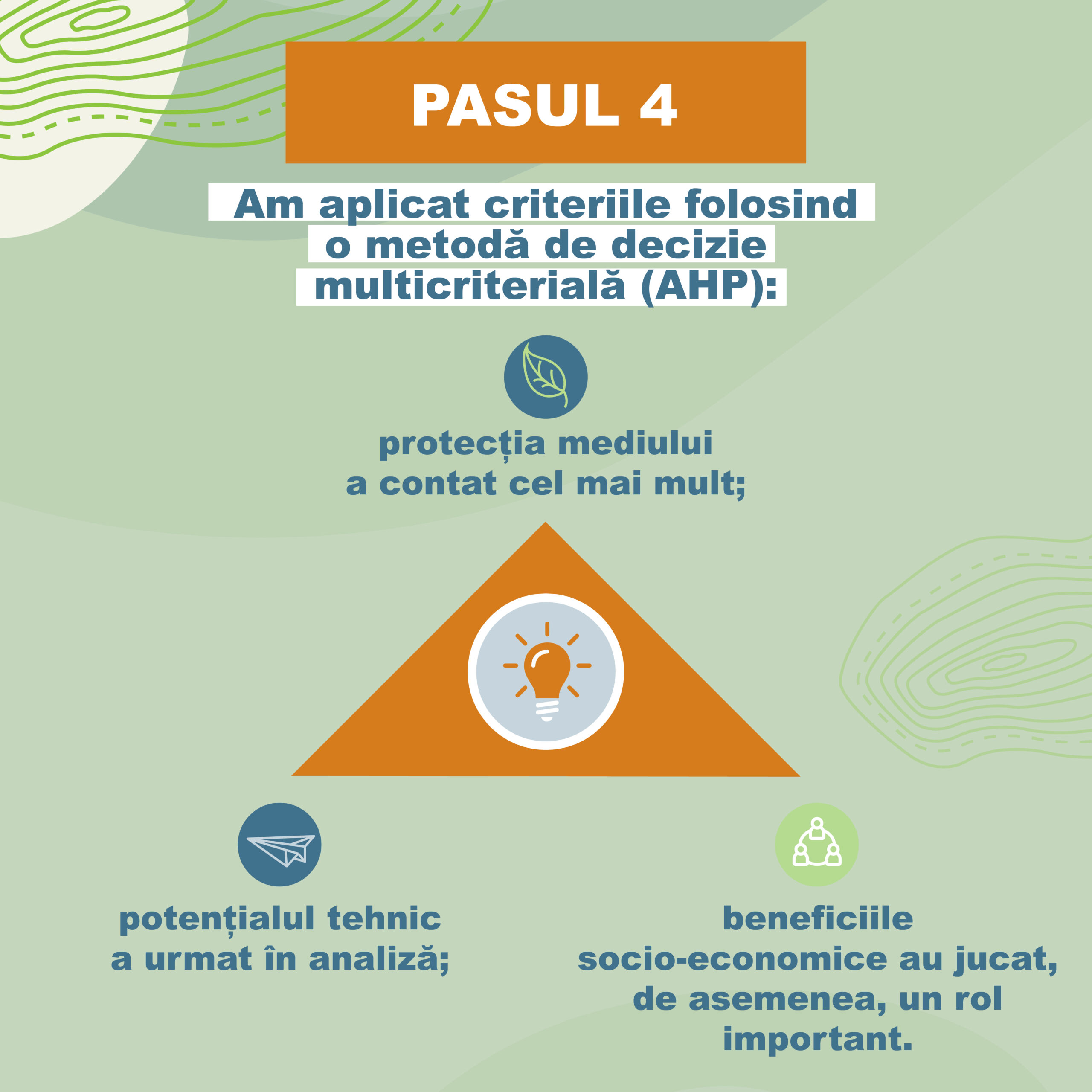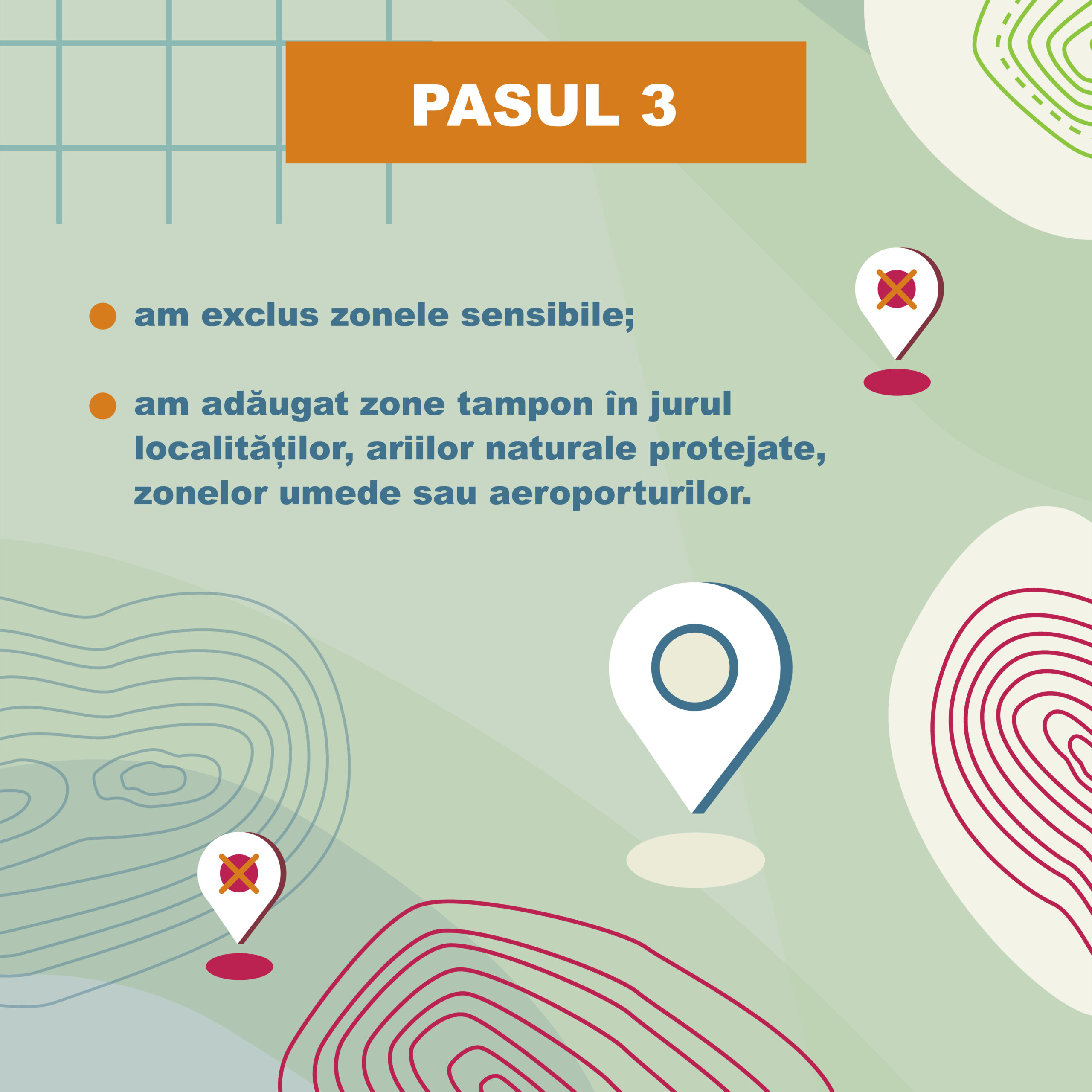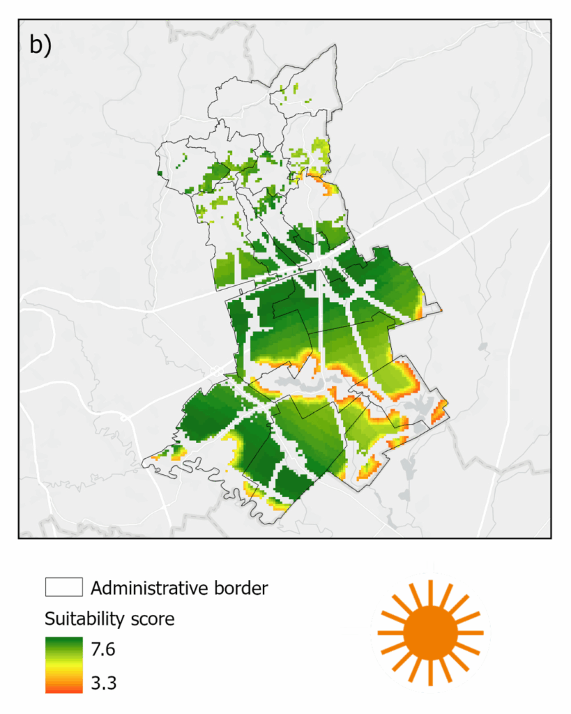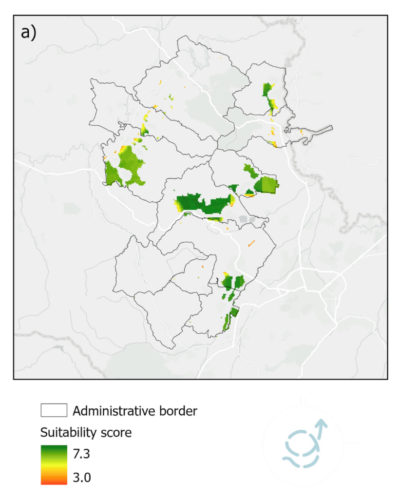 Următorul pas a fost excluderea zonelor sensibile pentru care am avut acces la date publice și adăugarea unor zone tampon în jurul localităților, ariilor naturale protejate, zonelor umede sau aeroporturilor. Criteriile au fost aplicate folosind o metodă de decizie multicriterială (AHP), în care protecția mediului a contat cel mai mult, potențialul tehnic a urmat în analiză, și unde beneficiile socio-economice au jucat, de asemenea, un rol important. În cele din urmă, zonele cu un scor ≥ 5 au fost recomandate ca potențiale zone de accelerare pentru energia regenerabilă.