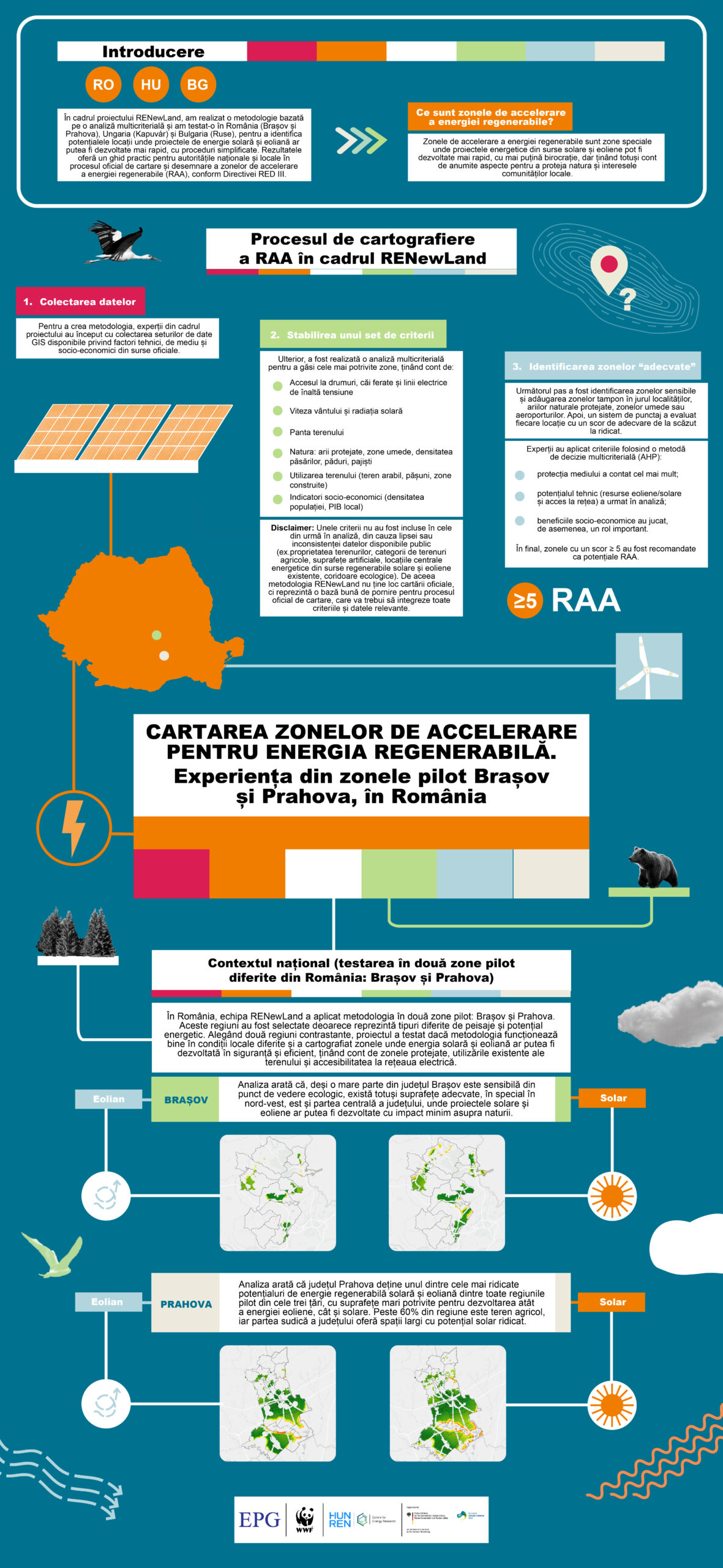 Ca răspuns la criza energetică și schimbările climatice, România, la fel ca toate celelalte țări din Uniunea Europeană, trebuie să accelereze tranziția energetică, cu un impact cât mai redus asupra naturii și în beneficiul comunităților locale, mai ales al celor dezavantajate din punct de vedere economic. Astfel, pentru a sprijini acest proces, în ultimii doi ani, am dezvoltat în cadrul proiectului RENewLand o metodologie bazată pe o analiză multicriterială, pentru a identifica potențialele locații unde proiectele de energie solară și eoliană ar putea fi dezvoltate mai rapid, cu proceduri simplificate. Ulterior, am testat această metodologie în două zone pilot, Brașov și Prahova, venind astfel în sprijinul autorităților locale pentru a accelera într-un mod sustenabil tranziția către energia din surse regenerabile.