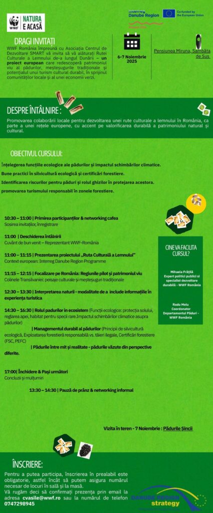 WWF-România, împreună cu Asociația Centrul de Dezvoltare SMART, invită ghizii locali, educatorii de mediu și toți cei interesați de turismul durabil să participe la un training dedicat Rutei Culturale a Lemnului de-a lungul Dunării – Danube Wood(s) Route –, parte din programul european Interreg Danube Region.
